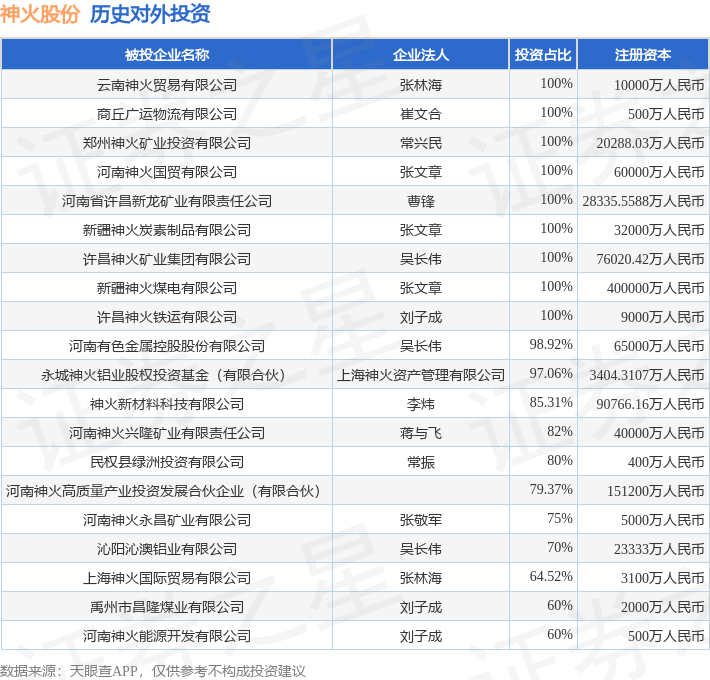 本站音尘,凭据天眼查APP表示,神火股份(000933.SZ)新增统统这个词对外投资事件,被投资公司为河南省深地清洁动力有限公司,法定代表东谈主陈永泽体育游戏app平台,投资占比为30%。该公司从事专科时刻奇迹业,注册本钱为500万东谈主民币。现在,神火股份共存在对外投资32项,投资占比前20的姿色见下表: